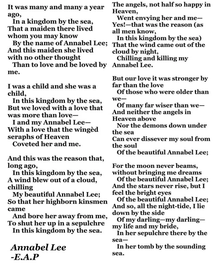 Le poème Annabel Lee d’Edgar Allan Poe est un chef-d’œuvre romantique souvent proposé dans les poèmes en anglais pour apprendre la langue autrement. Ce texte permet aux apprenants de plonger dans un anglais littéraire riche et mélodieux. Le vocabulaire utilisé, bien que parfois ancien, est très imagé et permet de découvrir des expressions poétiques comme sepulchre, seraphs of Heaven, ou encore highborn kinsmen. C’est un excellent support pour travailler la compréhension écrite et développer un lexique soutenu.