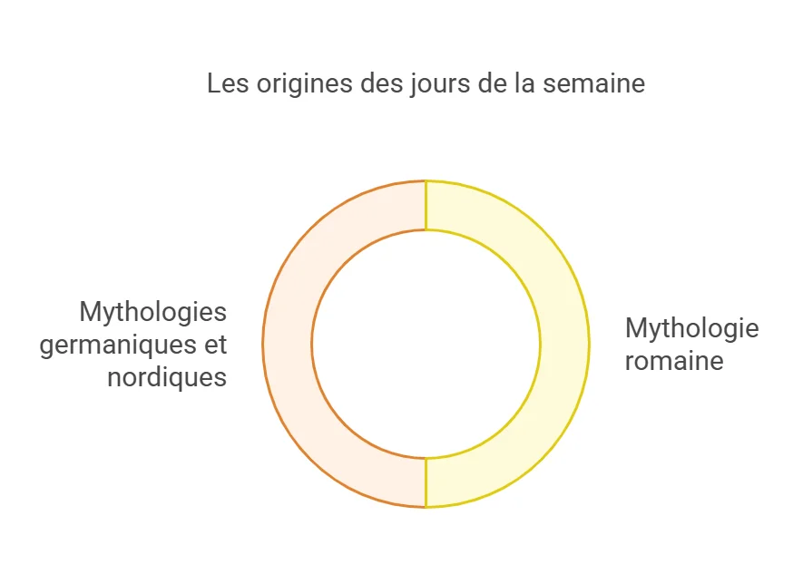 En français, les noms des jours sont presque exclusivement dérivés des dieux romains (Lundi pour la Lune, Mardi pour Mars, etc.). En anglais, on retrouve une influence germanique plus marquée, avec des dieux nordiques comme Tyr (Tuesday) ou Thor (Thursday).